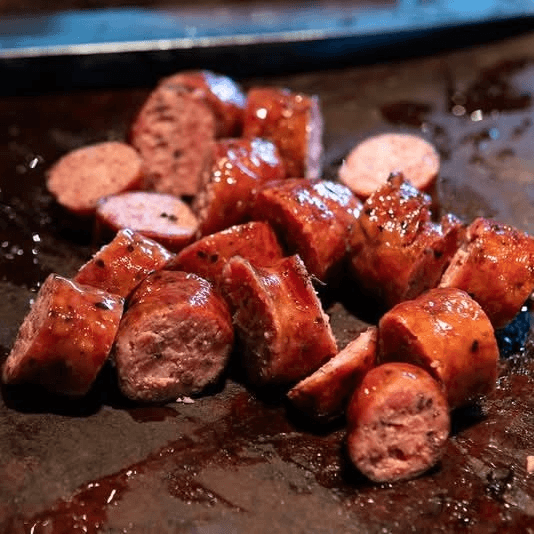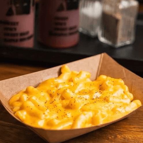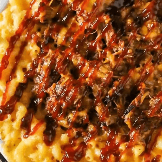 Pulled pork, turkey or sausage over mac and cheese
